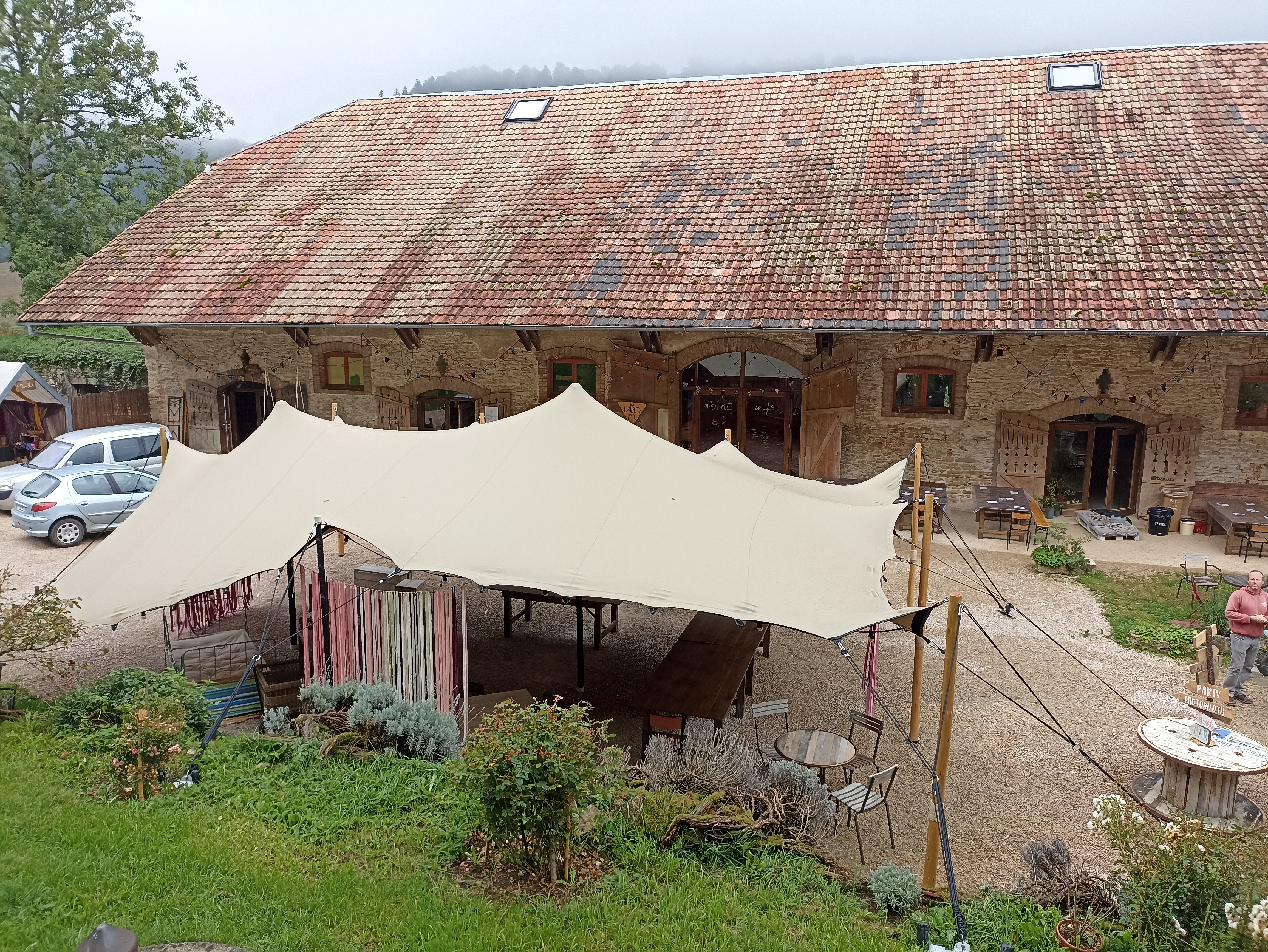 Très belle tente, élégante, bien finie dans les détails, spacieuse, parfaite pour festoyer malgré la pluie !
